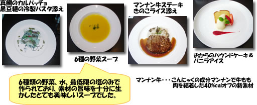 | 交流会では、健康にこだわった食事を提供しているレストランでコース料理をいただきました。今回は特別に野菜を多く油を控えめにしていただくようお店の方に配慮していただきました。 |