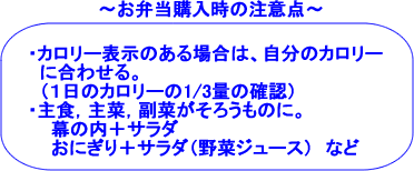 | コンビニで売っているお弁当を実際に見てご飯やおかずの種類、量、カロリーについて、 「自分が栄養士になったつもりで」皆さんで考えてみました。 いろいろな意見がでました。 その後クリニックの栄養士から話を聞きました。 |