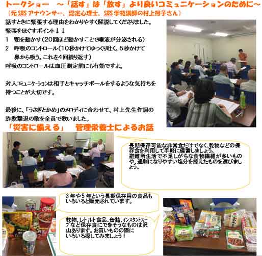 当日は13人の会員さんが出席し、「災害に備える」というテーマでクイズを交えながら勉強会を行い、エコノミークラス症候群予防の体操も習いました。 |