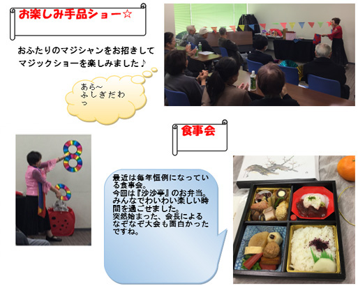 3年間会長を務めて下さった栗田さんが昨年末で退会され、総会では、新会長の推薦、役員(幹事)の選出がありました。新体制でスタートしてまいります。みなさま、今年もよろしくお願いいたします。 |
