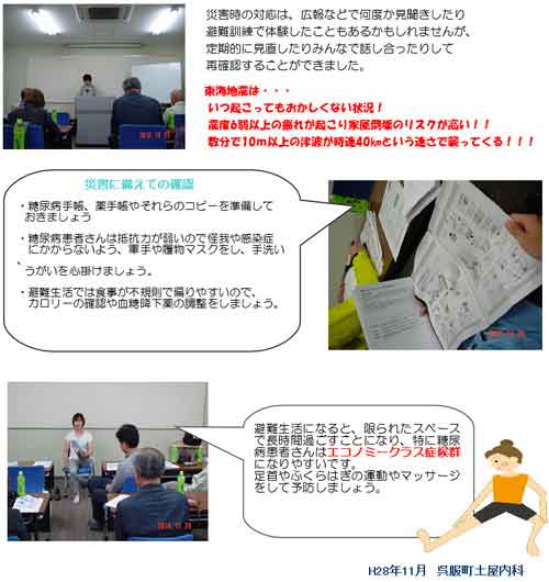 当日は13人の会員さんが出席し、「災害に備える」というテーマでクイズを交えながら勉強会を行い、エコノミークラス症候群予防の体操も習いました。 |