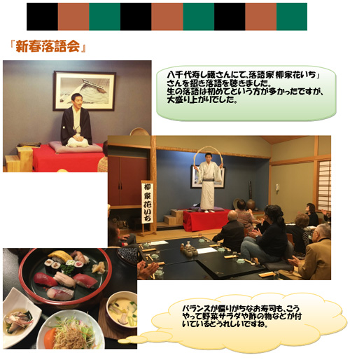 3年間会長を務めて下さった栗田さんが昨年末で退会され、総会では、新会長の推薦、役員(幹事)の選出がありました。新体制でスタートしてまいります。みなさま、今年もよろしくお願いいたします。 |